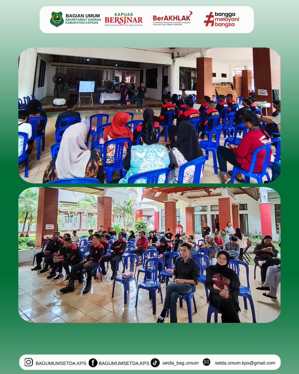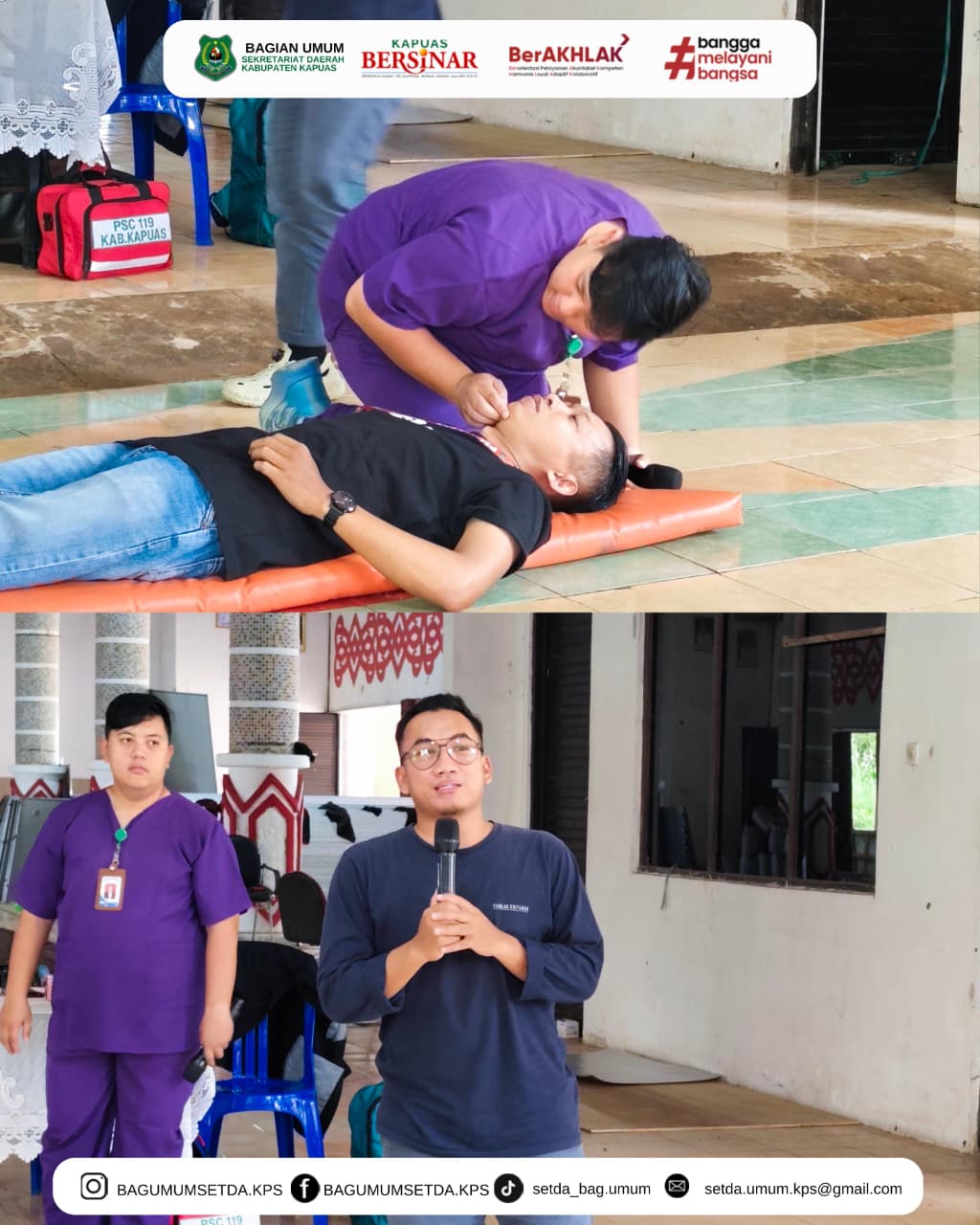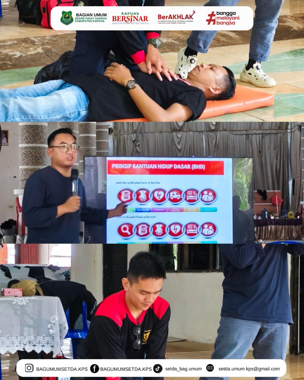 Kuala Kapuas, 5 Desember 2025 – Pemerintah Kabupaten Kapuas melalui Kepala Bagian Umum Sekretariat Daerah melaksanakan kegiatan Pelatihan CPR (Cardiopulmonary Resuscitation) dan Pertolongan Pertama untuk penanganan kondisi gawat darurat seperti serangan jantung dan korban jatuh. Bertempat di Aula Kantor Sekretariat Daerah Kabupaten Kapuas. Pelatihan diikuti oleh Petugas Keamanan Setda serta staf kariyawan Sekretariat Daerah Kab Kapuas , dengan tujuan meningkatkan kemampuan para pegawai dalam memberikan tindakan cepat dan tepat saat menghadapi keadaan darurat kesehatan di lingkungan kantor. Kepala Bagian Umum selaku penyelenggara menyampaikan bahwa pelatihan ini penting untuk memperkuat kapasitas internal dalam penanganan awal sebelum tenaga medis tiba. Peserta diberikan materi teori sekaligus praktik, mulai dari teknik dasar CPR, penggunaan alat bantu, hingga langkah pertolongan pertama pada korban jatuh atau kehilangan kesadaran. Kegiatan berlangsung dengan antusias, diakhiri dengan sesi simulasi yang melibatkan seluruh peserta. Diharapkan pelatihan ini mampu meningkatkan kesiapsiagaan, keselamatan kerja, serta memberikan manfaat nyata dalam upaya penyelamatan jiwa di lingkungan Setda Kabupaten Kapuas.